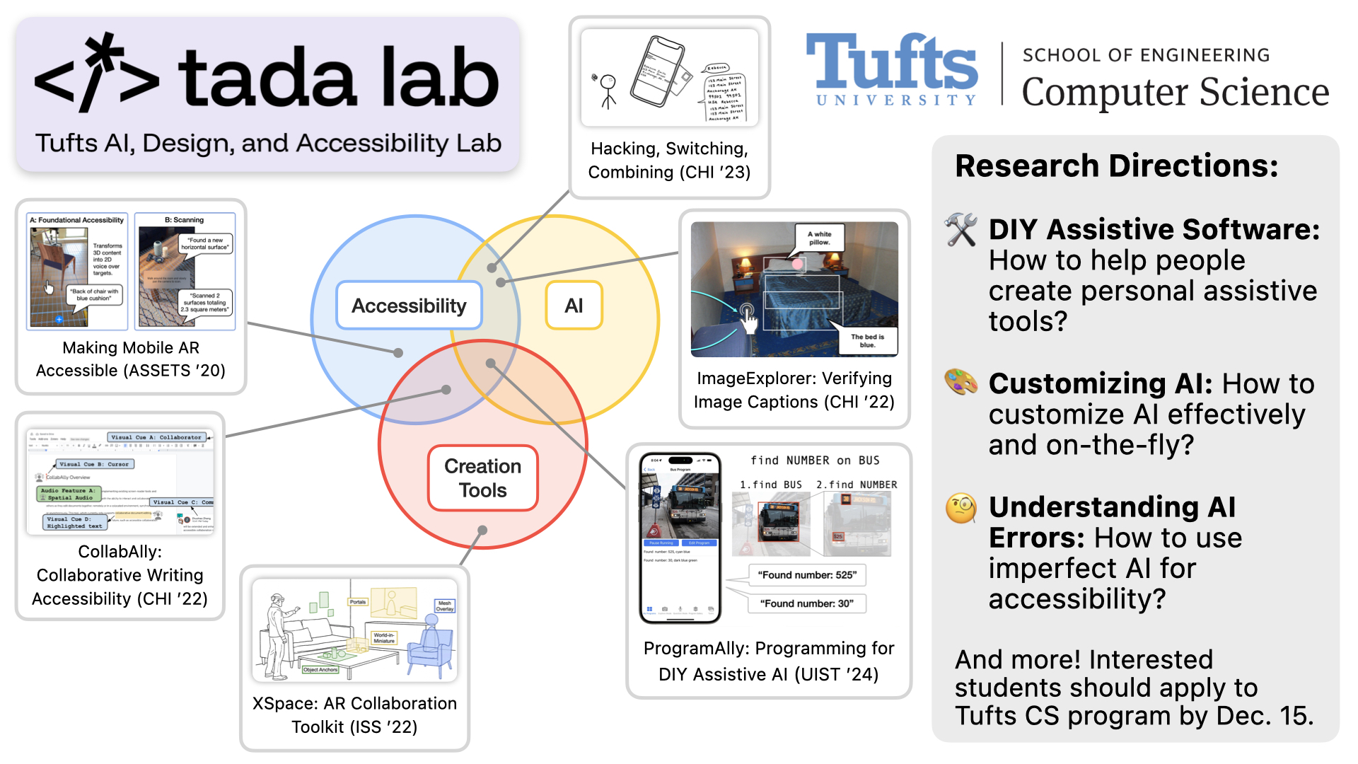 I'm currently building TADA Lab: the Tufts AI, Design, and Accessibility Lab, and looking for students who are passionate about creating assistive technologies and human-centered AI tools.